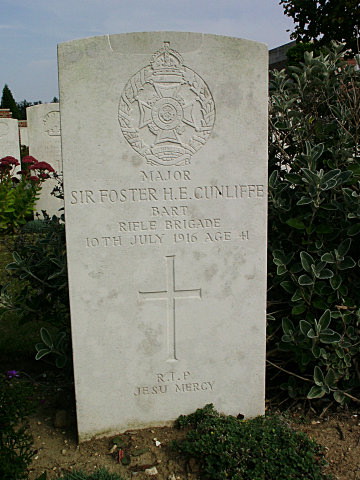 Major, Sir Foster Hugh Egerton Cunliffe was Killed in Action on this day 100 years ago and rests in Bapaume Post Military Cemetery, Albert with 409 other casualties, but of those only 229 are identified. He is also remembered in the cloisters of Eton College, where a rectangular tablet with indented corners has the following memorial in gold lettering ‘ In memorial F H E Cunliffe Baronetti Sexti de Acton viri amicis percari perjucundi qui apud Etonam et Oxoniam pilae artibus insignis in scholis annalium rei militaris diligens disipulus et doctor sociis coll anim adscriptus postea imles factus fideliter pro patria mortem oppetit XIII Die Julii MDCCCCXVI’
